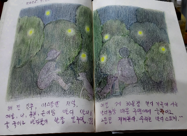 2025년 9월 19일 업둥이 강아지 홍복이와 온이를 산책 시키다가 반딧불이를 보았다.