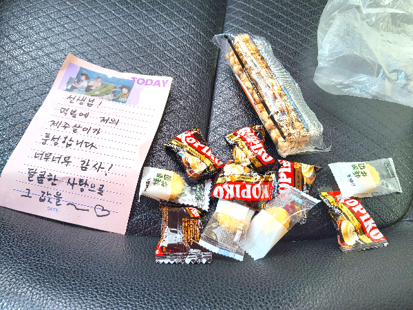얼마전 쪽지 편지에 이어서 사탕 선물까지 봉지에 매달려 있었다.